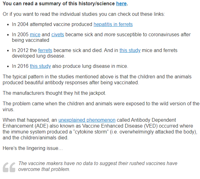 - i.e. If the majority of one’s peers received the shot, with no immediate, adverse reactions, one may presume, they too will be fine. What many don’t know is that in earlier animal trials of mRNA vaccines, they initially appeared to thrive. It was not until months later, when exposed to the virus in the wild, it was revealed vaccines had the opposite of the desired effect. The animals developed enhanced susceptibility to disease (ADE) & died. In spite of pleas to test for ADE prior to mass distribution, no such tests were conducted. A published study by the NIH found this risk has in fact been obscured from recipients, “obviating truly informed consent.”